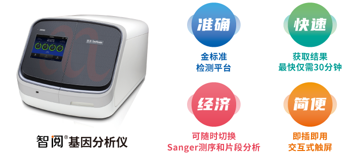 毛细管电泳CE平台作为基因检测的“金标准”平台,在中通量多基因检测中具有独特的优势。智阅基因分析仪采用创新技术支持在同一反应板上进行Sanger测序以及片段分析。创新型一体式卡夹耗材,使操作简单快速;精致小巧外观,内置计算机和集成触摸屏、全中文操作系统,使运行设置更加直观灵活;自动化空间及光谱校准,使仪器几乎无需人工维护。同时配备万象城AWC基因检测试剂盒,一次轻松进行多领域应用检测,给予一站式整体解决方案。
